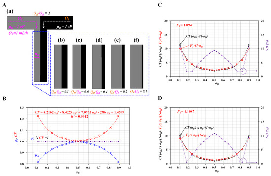 In Equation (11), F1 and F2 were obtained by obtaining the weighted average of CF (i.e., CF × (1 − αB)−1 or CF × αB × (1 − αB)−1) within a specific value of the interface. As the interface was relocated periodically within a specific range (0.1 < αB < 0.9), two approximate factors (F1 and F2) with constant values were calculated from Equations (12) and (13).