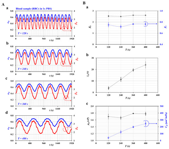 As shown in Figure 3A, temporal variations of αB and βB = (1 − αB)−1 were obtained with respect to the period ((a) T = 120 s, (b) T = 240 s, (c) T = 360 s, and (d) T = 480 s). Based on Equations (21)–(23), β0 and β1 were obtained at an interval of the corresponding period. Figure 3B-a showed variations of β0 and β1 with respect to T, where β0 and β1 fluctuated at a shorter period (T = 120, 360 s). However, they remained stable at a longer period (T = 360, 480 s). Figure 3B-b showed variations of λB with respect to T. The λB tended to increase linearly for up to T = 360 s. However, the slope of λB tended to decrease between T= 360 and T = 480 s. According to Equation (19), the λB was linearly proportional to the period (i.e., λB ~ T). The experimental results showed appropriately consistent variations of λB with respect to T. Using Equations (18) and (20), the blood viscosity (μB) and compliance (CB) were obtained with respect to T. As shown in Figure 3B-c, μB did not exhibit a linear dependency of T. It fluctuated at a shorter period. However, it remained constant at a longer period (T = 360, 480 s). The results agreed with Equation (18), which did not relate to the period. It was necessary, however, to set a longer period for consistently measuring the viscosity of the blood sample. Compliance (CB) tended to increase linearly for up to T = 360 s. The slope of CB tended to decrease between T = 360 and T = 480 s. According to the mathematical relation, CB was linearly proportional to λB. The experimental results indicated that blood viscosity was independent of period. However, compliance varied linearly depending on the period.