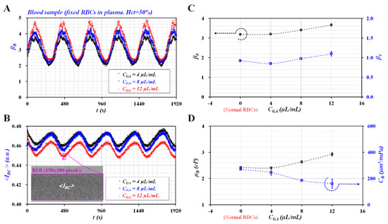 Figure 5A showed temporal variations of βB with respect to CGA. As the concentration of GA solution increased, βB tended to increase gradually. In addition, the βB exhibited steady and periodic variations over time. Figure 5B showed temporal variations of <IBC> with respect to CGA. The inset showed a microscopic image of the fixed blood sample (i.e., fixed RBCs with CGA = 12 μL/mL) captured at t = 480 s. The <IBC> tended to decrease slightly at a higher concentration of GA solution. However, it exhibited steady and periodic variations over time. The result indicated that the fixed blood sample with Hct = 50% did not induce the ESR in the driving syringe as shown in Figure 4.