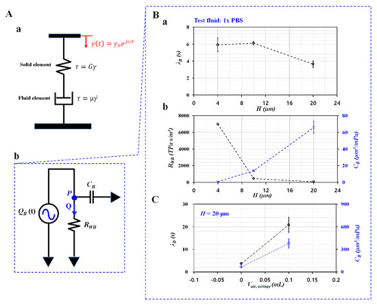 Mathematical representation and quantification of contributions of channel depth and air cavity to compliance. (A) Mathematical representation of conventional viscometer and microfluidic system. (a) Mathematical representation of conventional viscometer. (b) Mathematical representation of microfluidic system. (B) Evaluation of channel depth (H) on compliance. Here, 1x PBS as test fluid was infused into a microfluidic system. (a) Variations of λB with respect to H. (b) Variations of RWB and CB with respect to H. (C) Evaluation of air cavity on compliance.