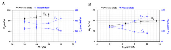 Quantitative compliance of GB and CB with respect to previous study [18] and present study. (A) Variation of GB and CB with respect to Hct. (B) Variations of GB and CB with respect to CGA.