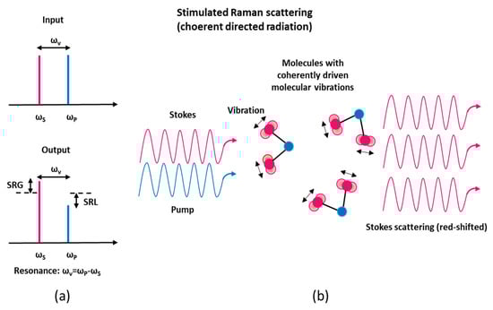 SRS can be obtained by irradiating a sample with two simultaneous light sources: a light wave at frequency ωL (the pump laser wave) and a light wave at frequency ωS = ωL − ωυ (the Stokes Raman wave), where ħωυ corresponds to a vibrational energy. In SRS phenomenon, when the frequency difference between the pump and the Stokes laser beams matches a given molecular vibrational frequency of the sample under test, there is a transfer of energy from the high power pump beam to the probe beam, which can be co-propagating or counter-propagating. The SRS effect occurs in the form of a gain for the Stokes beam power (stimulated Raman gain, SRG) and a loss for the pump beam power (stimulated Raman loss, SRL), see Figure 1a. It is worth noting that in SRS, because of its coherent nature, the molecular bonds oscillate with a constant phase relation (see Figure 1b) and interfere constructively within a certain macroscopic area (e.g., inside the focus area of laser beam), therefore the SRS signal can be orders of magnitude more sensitive than spontaneous Raman scattering [,,,].