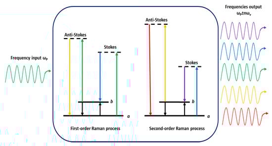 In SRS, high-order Raman sidebands can be produced by a field propagating through a medium optically polarizable. Many Stokes frequencies can be generated at the output when the pump power exceeds the threshold value, thus Stokes frequencies at ωP − ων, ωP − 2ων and of anti-Stokes frequencies at ωP + ων, ωP + 2ων can be observed. If the intensity of the first-Stokes wave is enough high, it can generate a ‘‘second-Stokes’’ beam (see Figure 2). By iterating this process, higher Stokes order can be generated, leading to the so-called ‘‘cascaded’’ SRS. The intensity of the ith Stokes order thus depends on the conversion rate from the (i − 1)th Stokes order (proportional to g·Ii·Ii−1) and loss rate to the (i + 1)th order (proportional to g·Ii·Ii+1) where g is the Raman gain of material. We note that frequency conversion can be obtained over a wide range of output wavelengths (visible and UV) within a single Raman laser system. For example, it is possible to use standard diode-pumped crystalline solid-state lasers to generate several Stokes order by cascading effect [,,,,,].