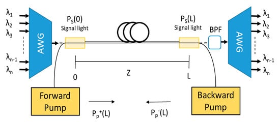 Figure 3 shows a configuration in which pumping light propagates bi-directionally in distributed FRA. Moreover, the system is provided with band pass filter (BPF) and arrayed waveguide grating (AWG) devices which act as demultiplexing unit in the receiving side.