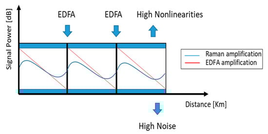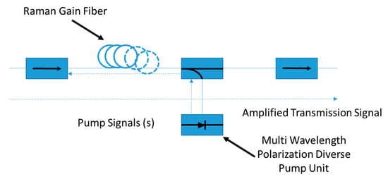 We note that the process of Raman amplification takes place so rapidly that, unless the intensity noise of the forward pumping light is sufficiently small, the pumping light noise will be transferred to the signal light resulting in increasing transmission bit error rates. Since signals propagating in the opposite direction to the pump will average over the fluctuations, in order to mitigate unwanted crosstalk between the pump and the signal, in many cases only backward pumping is used [,]. Typically, high-powered counter propagating Raman pumps are deployed in conjunction with discrete amplifiers, such as EDFAs.