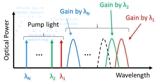 Using a broadband pumping approach, amplifiers with gain bandwidths greater than 100 nm have been demonstrated [] with average net gain of 2 dB gain for SMF, while for dispersion-shifted fiber and reverse dispersion fiber the net gain was of 6.5 dB. A 12- wavelength-channel WDM LD (high-power laser diode (LD) pumping unit), with a range of wavelength from 1405 to 1510 nm and combined by an Il-MZI-integrated, using a planar lightwave circuit technology, were used to enlarge the gain bandwidth of Raman amplifiers [] However, due to a strong interaction between pumps, these broadband FRAs typically need of more power at the shortest wavelengths pumps which amplify the longer wavelegth pumps, leading to at an increase of the noise properties.