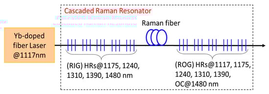 Schematic representation of a Raman fiber laser with multiple wavelength shifts by using a cascaded Raman resonator (RIG—Raman input grating set, ROG—Raman output grating set).