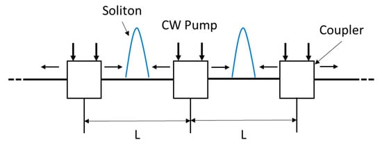 Optical communication systems are often limited by fiber dispersion that broadens the pulse and by fiber losses. The use of fundamental solitons as an information bit solves the prolem of dispersion, because in a fiber channel, nonlinear phase modulation can compensate for linear group dispersion leading to pulses that propagate without changing temporal shape and spectrum. This mutual compensation of dispersion and nonlinear effects takes place continuously with the distance in the case of “classical” solitons and periodically with the so-called dispersion map length in the case of dispersion-managed solitons. Due to the fiber losses, soliton width begins to increase because of a decrease in the peak power during propagation inside the fiber, so amplification is required in order to recover original width and peak power. A proposed scheme makes use of SRS [,,,]. Figure 9 showes the basic idea. Solitons are launched into a fiber link consisting of many segments of length L. At the end of each segment, pump lasers inject CW light, upshifted in frequency from the soliton carrier frequency by about 13 THz, in both directions through wavelength dependent directional couplers. Since the Raman gain is distributed over the entire fiber length, the soliton can be adiabatically amplified.