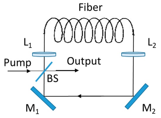 Schematic representation of the ring-cavity geometry implemented for Raman soliton lasers. BS is a dichroic beamsplitter, M1 and M2 are mirrors of 100% reflectivity, L1 and L2 are microscope objective lenses.