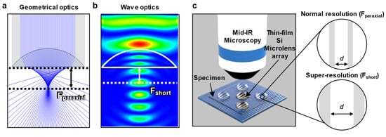 When the optical lens size is much larger than the wavelength of light, the wave characteristics such as interference and diffraction can be ignored, and the optical phenomena can be expected by geometrical optics. Thus, optical imaging through lenses can be simply simulated by ray-tracing methods, as shown in Figure 1a. The paraxial focal length is described as Fparaxial = R/(n − 1), where R is the radius of curvature (RoC). However, in wave optics, as the lens decreases to the wavelength, the interference between the incoming and refracted wave is more influential, resulting in a shorter focal length (i.e., Fshort) than Fparaxial (Figure 1b). This shortened focal length in the SIL implies improved magnifying ability according to M1/F, where M is magnification, when the object distance smaller than the focal length. A schematic of an objective lens of a MIR-microscope system and a specimen substrate with µ-SIL shows that the image is enlarged by using µ-SIL as small as the wavelength with the focal length shorter than geometrical Fparaxial, which has been mentioned in several previous articles for the visible wavelength range [,,,,,].