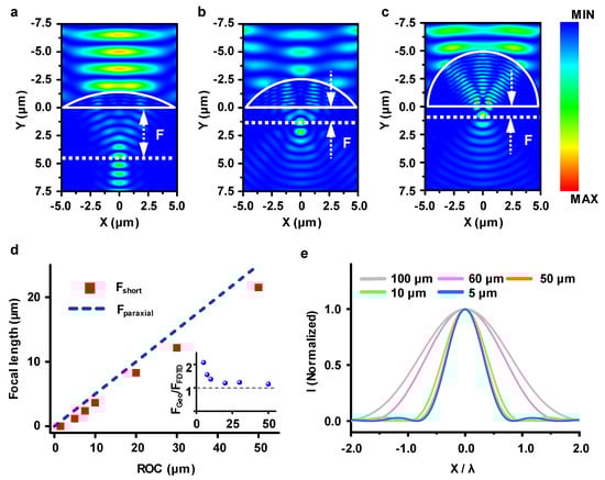 Figure 2d,e represent the focal length and full width at half maximum (FWHM) of the focal spot by which we could evaluate the spatial resolution of the combined microscope imaging system. As expected, Figure 2d shows the clear difference between the result of the calculated focal length from geometrical optics (blue-dashed line, Fparaxial = R/(n − 1)) and those from the FDTD simulation (red markers). The obvious difference between them is because of a focal shift caused by diffraction of the incident light [,]. It should be noted that the degree of focal shift becomes clearer as the size of the lens scales down to the wavelength scale dimension, as shown in the inset of Figure 2d, representing that diffraction starts to dominate the focal property of the lens. For the same reason, as shown in Figure 2e, the FWHM of the focal spot becomes narrower as the dimension of the lens scales down and converges to ~0.5 µm (λ/6), at which we considered that the FWHM starts to become independent of the dimension of the lens. From the analysis of the simulation results, we confirmed that this transition occurs at RoC ~10 µm, clearly indicating the emergence of super-resolution imaging.