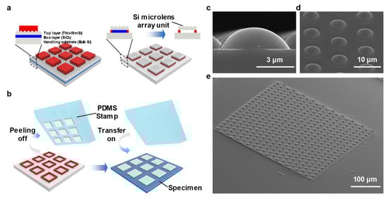 Here, we propose a novel fabrication and integration schemes for a µ-SIL in a thin-film, microlens array structure. Despite the fact that most previous research has adopted the microsphere-type SIL, we consider a plano-convex microlens on a thin-film plate as the optimized design for µ-SIL-based MIR microscope systems for three main reasons: (1) the flat rear surface of the µ-SIL allows it be aligned and in contact with a sample much simpler than in the case of a microsphere; (2) the µ-SIL is fabricated as a transferable thin-film form factor, so that it can be reusable through a transfer printing process; and (3) engineering the optical properties of the lens can be realized relatively easily by use of the following fabrication processes. The target device size of wavelength scale could easily be implemented by well-known micro-fabrication technologies, such as photolithography, thermal reflow, and dry etching processes, which were employed for the fabrication of silicon microlens array []. In order to fabricate the µ-SIL, AZ5214 photoresist was spun and patterned by conventional photolithography on a silicon on insulator (SOI) wafer. Then, a thermal reflow process was conducted at 180 °C for 90 s. The underlying top Si layer was etched by reactive ion etching in an SF6/O2 gas mixture under optimized conditions. Precise control of the fabrication condition is needed to realize the desired shapes of the µ-SILs. To integrate the µ-SIL onto the specimen substrate of interest, we adopted and adjusted a series of micro-fabrication processes including transfer printing from the previous literature of flexible and stretchable devices, as illustrated in Figure 4a,b [,,]. Therefore, as shown in Table 1, the thin-film silicon microlens array has a printable characteristic that cannot be achieved by the existing micro-fabrication technology [,,,,,,,,], and thus has great advantages for biochemical imaging of cell/tissues compositions requiring alignment with uneven samples in mid-infrared wavelength. Scanning electron microscopy (SEM) images of the resultant µ-SILs at various magnifications are shown in Figure 4c–e.