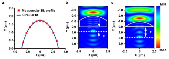 The silicon µ-SIL manufactured by the above method extracted meaningful lens information through image analysis by a commercial tool (MATLAB, Mathworks, Inc., Natick, MA, USA). As shown in Figure 5a, as the profile of the fabricated µ-SIL matches the circular fitting, the lens was demonstrated in a nearly perfect plano-spherical convex structure. The geometrical information of µ-SIL is shown in Table 1, with a radius of 3.3 µm, a diameter of 5.8 µm, and a height of 1.723 µm. Further, the radius-to-height ratio (~1.9:1) is analogous to the prediction result used in the FDTD simulation. In addition, computation studies for the fabricated µ-SIL with and without the thin-film substrate are exhibited in Figure 5b,c. These simulations demonstrate that front focal lengths of µ-SIL are independent to the presence of the thin-film substrate. The independency of µ-SIL for the thickness of substrate allows for practical design of silicon µ-SIL, which facilitates fabrication and transfer-printing. Also, such an imaging feature of µ-SIL can control the distance between a sample and the fabricated silicon µ-SIL by modifying the thickness of thin-film substrate because the lens is conformally in contact with the sample using the transfer-printing method. This distance-variable property allows for the magnification adjustment of the obtained image [].