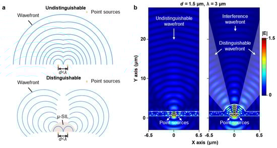 The optical properties of silicon µ-SIL are illustrated in Figure 6a []. A wavefront of far-field is not separated when two point sources are located at a shorter distance than the wavelength (Figure 6a; undistinguishable). However, the silicon µ-SIL enhances the spatial resolution by remarkably high numerical aperture, resulting from the high refractive index of silicon (Figure 6b; distinguishable). Figure 6b computationally demonstrates the super-resolution of silicon µ-SIL. The simulation model of silicon µ-SIL has geometrical parameters listed in Table 2. Without the silicon µ-SIL, two point sources with d = 1.5 µm (i.e., d = λ/2) generate the undistinguishable wavefront in far-field. However, by introducing the silicon µ-SIL, two point sources could be classified even at far-field. Between two distinguishable wavefronts, the interfered wavefront is also observed.