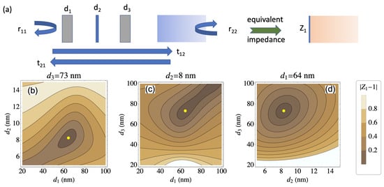 (a) Schematic representation of the structure consisting of three layers (silica, metal, silica) with respective thicknesses (, and ) on top of the thick metal layer. The field coefficients are defined in the text. (b–d) impedance mismatch as a function of the different layer thicknesses for normal incidence at a wavelength ( nm). The yellow dot corresponds to the layer thicknesses ( nm, nm, nm) minimizing overall back-reflection .