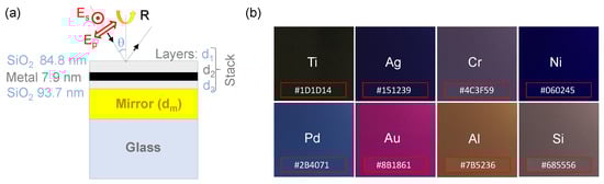 Soda lime substrates of 1 mm thickness with deposited thin films of metal and SiO2 layers were fabricated to produce the optical absorbers. The films were deposited using an AXXIS physical vapor deposition (PVD) chamber (Kurt J. Lesker Company, Jefferson Hills, PA, USA) via electron beam evaporation (EBE) deposition with 4N (99.99%) material purity minimum and a base pressure of at least Torr. Film thickness was determined by quartz crystal monitors (QCM) and tooling factors were calibrated by measuring step height of the thin films using atomic force microscopy (AFM). The simulated and initial optical absorber was fabricated using titanium (Ti) and SiO2. Other materials such as silver (Ag), chromium (Cr), nickel (Ni), palladium (Pd), gold (Au), aluminium (Al), silicon (Si), and titanium dioxide (titania, TiO2) in place of Ti for layer were tested for production of colored films as shown in Figure 2b. The hexadecimal values are extrapolated from color averages in the images when taken at 10° from normal incidence in white fluorescent lighting. The thicknesses shown correspond to the calibrated set point of the evaporation conditions.