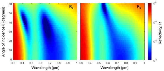 Plots of the simulated of reflectivity for s- and p-polarisations at different angles of incidence 0–60 within the 0.3–1 m spectral window. The stack was SiO2/Ti/SiO2 with thicknesses of nm, nm, nm on a 100-nm-thick Ti mirror on a soda lime glass substrate (see stack geometry in Figure 2a).