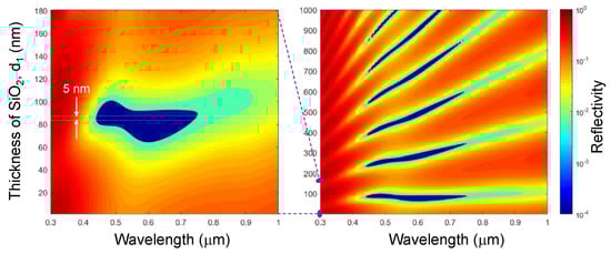 Plots of the simulated reflectivity R spectrum of a thin-film stack (Figure 2a) SiO2/Ti/SiO2 optical absorber, where the mirror layer was Ti dm = 100 nm; note the logarithmic scale of R. The thickness of the first layer SiO2 was varied from 0 to 180 nm (left panel) to determine the minimum of R which was found at nm. The darkest blue region has ≤ 1.3% reflectivity in the 430–960 nm spectral range. Other parameters are: nm, nm, nm and normal incidence .