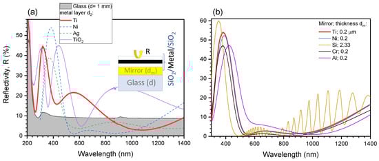 It is noteworthy that the structure was not simulated nor optimized for Ag and Ni and was deposited for comparison but not as calculated impedance matched structures. Figure 2b shows appearance of the black-metal mirrors whose reflectance is presented in Figure 5a. Titania (TiO2) was also tested as layer-2 since Ti can be oxidized after exposure to room conditions and the SiO2 layers. Strong reflectivity around 400 nm (3.1 eV) was observed. This is consistent with band-gap edge absorption of titania. At the strong absorption, low reflectivity is expected when as in the studied case. At the condition of , light localization on the front surface was revealed by numerical simulations with intensity enhancement (Figure A3b). This can be a useful feature for Raman scattering since front-irradiation causes the intensity maximum before the interface which is not optimum for sensors, and the back-side (through the substrate) has to be used for the exact intensity maximum positioned on the interface [20].