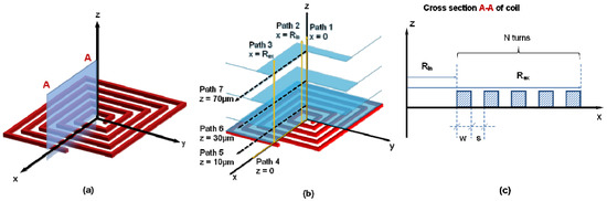 Figure 2 shows the simulation results of the magnetic flux density on all paths (from path 1 to 7) above the surface of the square microcoil with the following parameters values: Rin = 500 μm, N = 20 turns, w = 10 μm, s = 10 μm and h = 15 μm.