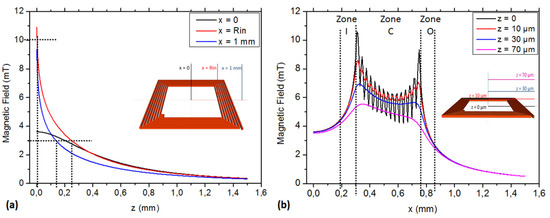 Figure 2b shows the B modulus in several paths parallel to the coil surface. As observed in previous paragraph, the B modulus decreases with higher distances to the coil’s surface. B modulus strongly decreases at the coil edges (x > 500 μm). The FEM original result is the strong B modulus ripple at a distance below z ≈ 10 μm (Zone C). According to Equation (4), B ripple and amplitude combine to improve the trapping efficiency of the coil in the near vicinity to its surface. The B modulus ripple is then a helping factor for trapping. Nevertheless, the B ripple cannot be considered as a primary trapping design parameter. In our case, the PDMS protecting layer is several μm thick (see Section 3.2.2). Only in few cases is the channel height below 10 μm, and then in the vast majority of cases, the B ripple will only help in a small fraction of the microchannel, just above the coil. The B modulus neglecting the ripple is the main parameter to be taken into account.