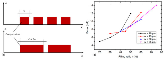 We started with the spacings between conductors of s = 10 μm, which correspond to a safe lower limit when using the thick copper micro-molding process. For given spacings and widths of the conductors, the filling ratio increases with respect to N (Figure 4a). Its higher limit is given by the ratio w/(s + w): the width of the conductors to the sum of the width and spacing of the conductors. Figure 4b shows the maximum modulus of flux density Bmax (for Rex = 500 μm) generated with coils for different conductors’ width and turn numbers (w and N) at path 5 (z = 10 μm). In this graph, the Bmax increases with the rise of N at a given w value. The obtained filling ratio values are between 20% and 75%. In our simulation, the current density was fixed with the expectation to determine the corresponding value of Bmax. From the obtained Bmax, the relationship between the number of turns and the width of the conductors was then determined. This relationship depends on the ratio of filling Cu (r) on the coil surface presented in Figure 4.