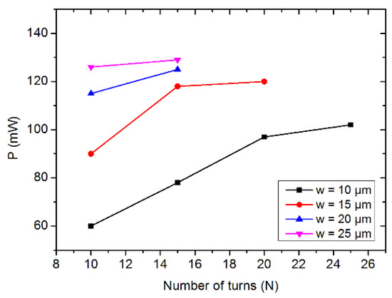 Figure 5 shows the variation of power consumption in coils (Rex = 500 μm) as a function of the turn number for several widths of copper conductors.