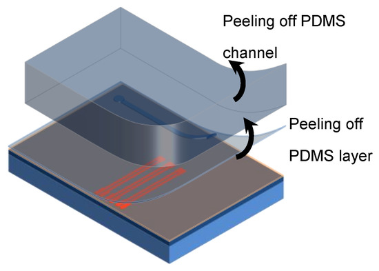 After bonding, both the channel cap and PDMS coil protective layer can be easily peeled off the bottom substrate (Figure 10). Thus, the bottom substrate can be reused after each experiment carried out in the channel. The reuse process would start by spin-coating a new PDMS thin layer for a new bonding cycle.
