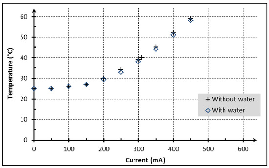 The experimental setup is represented in Figure 8. A DC current was injected in the coil by a power supply in two conditions: one with the injection of water by pumping, at a continuous flowrate of 12 μL/min, and the other without flow rate through the microchannel. The DC current and temperature were recorded after 10 min to allow thermal stabilization of the chip. Figure 11 shows the measured temperature in the close vicinity of the microchannel as a function of the current flowing through the coil in stationary conditions.