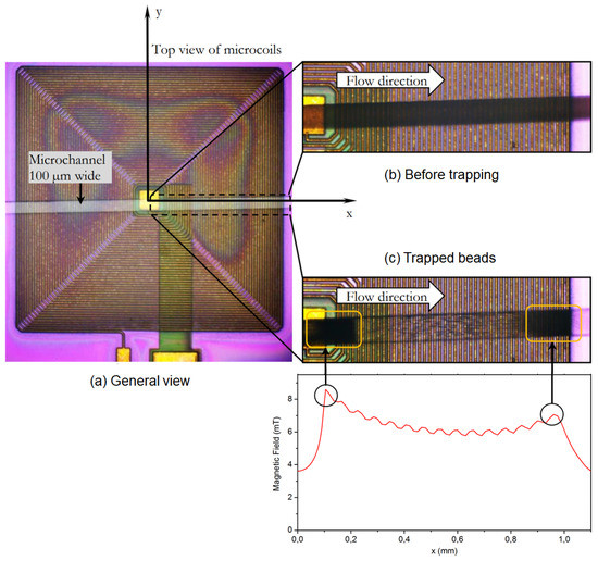 The magnetic field intensity (B) modulus is higher in close vicinity to the coil. Equation (1) determination corresponds to the rough 1/x shape observed in Figure 2a. Conversely, the trapping capability is higher in the near vicinity (some μm above) of the coil’s surface. For microfluidic considerations, the trapping force depends on the distribution of magnetic force along z-axis [33]: it can be predicted to be high in the bottom of the microchannels but with a fast decrease. An order of magnitude can be deduced from Section 2.1 results: in z direction, the trapping force is approximately 10 times less at z = 0.2 mm compared to z = 0.