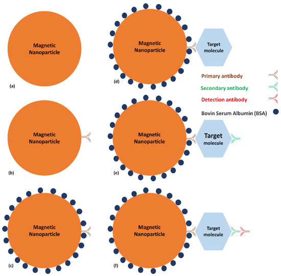 The different steps of an immunoassay with an MNB: (a) MNB alone, (b), Addition of the primary antibody (c) Protection with BSA, (d) Addition of the target molecule, (e) Addition of the secondary antibody, (f) Addition of the detection antibody.