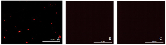 Fluorescent images of (A) whole biografting process is respected; (B) we skipped the primary antibody grafting step; and (C) we skipped the Ovalbumin grafting step. In (B,C) we showed that immunoassay cannot be performed without this step (we had a great specificity).