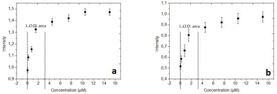 Therefore, to evaluate the sensitivity of the Ovalbumin fluorescence detection using the two strategies of experiment (in microtubes and in microfluidic system), we have calculated the limit of detection (L.O.D.) of the target biomarker. The L.O.D. was determined using the standard formula commonly used in immunocapture experiments [35,36]: