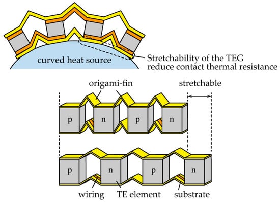 Thermoelectric generators (TEGs) are devices used to convert thermal energy into electrical energy using the Seebeck effect by providing a temperature difference to thermoelectric (TE) elements [1,2]. Recently, the distribution of many sensors in various places in the environment has been proposed, and TEGs represent a potential power source for those sensors [3,4,5,6]. For example, there have been reports of bendable TEGs [7,8,9,10,11,12,13,14,15] and stretchable TEGs [16,17] for IoT devices or wearable devices that attach to curved heat sources (such as piping, car bodies, and the human body). In particular, a stretchable TEG is needed so that it can be attached with low thermal contact resistance to curved heat sources and harvest energy from them [16]. Furthermore, the TEG’s heat radiation performance is also important for power generation. Generally, the heat radiation performance is improved by attaching a heat radiation fin to the TEG. It is, however, difficult to attach a conventional heat radiation fin while maintaining stretchability because conventional fins are made from rigid and non-stretchable materials such as metals or ceramics. Thus, a stretchable TEG integrated with a fin for heat radiation has been necessitated. In previous studies, although the production of stretchable TEGs that used a folded substrate was reported, the folded substrate was not considered to be a heat radiation fin [17]. Therefore, we decided to develop a stretchable TEG with a high heat radiation performance that uses a folded substrate as a heat radiation fin.