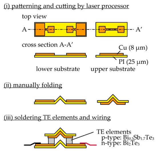 Figure 2 shows the fabrication process of the TEG with the origami-fin. We first fabricated the upper and lower substrates using copper-polyimide films (polyimide: 25 μm-thick, copper: 8 μm-thick). Using a UV laser processor (OPI Corporation, OLMUV-335-5A-K, Saitama, Japan), the copper layer of the film was scratched and patterned. Then, the film was cut by a UV laser processer. After the substrates were folded manually, a single pair of TE elements (TOSHIMA Manufacturing, Saitama, Japan, p-type: Bi0.3Sb1.7Te3, n-type: Bi2Te3, 1.5 mm × 1.5 mm × 1 mm) and wirings were soldered onto the substrates. The TE elements were assembled in a π-type structure, which is a typical structure of the out-of-plane TEGs, electrically in series and thermally in parallel [2].
