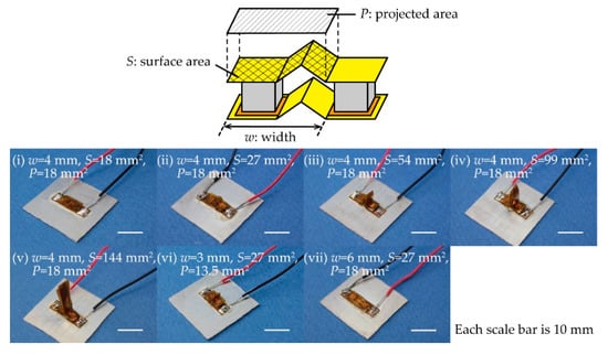 The fabricated TEGs are shown in Figure 3. As shown in the top of Figure 3, we defined an evaluation unit to contain one flat plate region and one folded region and defined the width as w (mm), the substrate surface area as S (mm2), and the substrate projected area as P (mm2). Each TEG was fixed to an aluminum plate (25 mm × 25 mm × 0.5 mm) with an adhesive that had high thermal conductivity (Cemedine, SX1008, Tokyo, Japan) to maintain its shape and facilitate repeated experiments. First, in order to evaluate the heat radiation performance of the origami-fin, five types of TEGs containing origami-fins with various surface areas (S of 18 mm2, 27 mm2, 54 mm2, 99 mm2, and 144 mm2), were fabricated (Figure 3i–v). All of these devices had a width of 4 mm, which means that all the projected areas were equal. The TEG with S of 18 mm2 was configured in a flat state with the same projected and surface area. The other four TEGs had larger surface areas that ranged from 1.5 to 8 times the projected area. Next, in order to evaluate the stability of the output when the origami-fins were stretched and contracted, three types of TEGs with origami-fins that had the same surface area and different widths were fabricated. Those TEGs had widths of 3 mm, 4 mm, and 6 mm, respectively, and were fabricated from a substrate with S of 27 mm2 (Figure 3ii,vi,vii). The TEG with w of 6 mm was maximally stretched so that it became flat, and the other two TEGs were contracted by folding the origami-fin.