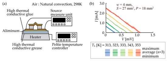We obtained the open-circuit voltage (VTEG) (V) of the TEGs by measurement and simulation to evaluate the heat radiation performance of the origami-fin and the dependence of the output stability on stretching. We first measured the current (I) and voltage (V) characteristics of the fabricated TEGs using the measurement setup shown in Figure 4a and then calculated the VTEG of the TEGs from the measured I–V characteristics. The TEG with an origami-fin that was fixed to an aluminum plate was placed on a heater using grease that had high thermal conductivity (Shin-Etsu Silicones, G-747, Tokyo, Japan). The temperature of the heater was controlled by a Peltier temperature controller (VICS, VTH1.8K-70S, Tokyo, Japan) and was increased from 313 K to 353 K in increments of 10 K. The room temperature was approximately 298 K while these measurements were made. The output current was measured by sweeping the applied voltage to the device using a source measurement unit (Keithley Instruments, 2614B, Cleveland, OH, USA). Three experiments were performed using each device. The measured I–V characteristics of the TEG with w of 4 mm and S of 27 mm2 are shown in Figure 4b as an example. We obtained the VTEG from the x-intercept of the regression line calculated by the least squares method. Measurements were taken at different temperatures to examine the dependence of the TEGs on temperature, but we set the VTEG at 323 K for evaluation.
