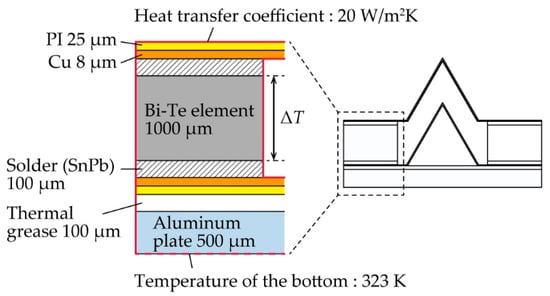 To confirm the validity of the measurements, we simulated the VTEG using an FEM. As shown in Figure 5, we created 2D simulations that were the same size and constructed of the same materials as the TEGs we fabricated. We set the temperature of the bottom of the device at 323 K and the heat transfer coefficient at 20 W/m2·K for the outer boundaries of the model. This value was set within an appropriate range for the value of the heat transfer coefficient between the solid material and natural convection air [18]. The thermal contact resistances between each material were not included in the model. We used this model to simulate a steady-state temperature distribution and calculated the VTEG by multiplying the temperature difference between the top and bottom of the BiTe-based TE element (ΔT) by the Seebeck coefficient of the TE element. The Seebeck coefficient of the BiTe-based TE element at a temperature of 323 K was obtained from Sp−Sn = 317.2 × 10−6 V/K by the material data sheet, where Sp and Sn are the Seebeck coefficients of the p-type and n-type elements, respectively.