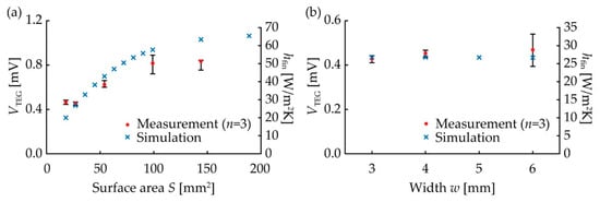 Measurement and simulation results. The temperature of the heater was 323 K and the air was 298 K. (a) VTEG and hfin vs. S. (b) VTEG and hfin vs. w.