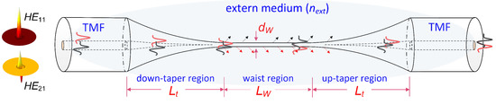 A ring–core two-mode fiber (TMF, http://www.yofc.com) was employed. Its cross-section and index profile can support fundamental (HE11) and second-order (HE21) modes. The spatial profile of such modes is depicted in Figure 1. Tapering the two-mode fiber is recognized as a straight and efficient tool to achieve a uniform modal interference mainly involving the HE11 and HE21 modes. Thus, we propose a tapered two-mode fiber (TTMF)-based biosensor structure, which consists of an input SMF, a down-taper region, a TTMF section, an up-taper region, and an output SMF. Note that the number of modes existing in the TTMF is determined by its diameter (Dw) and the external surrounding (next) [17]; thus, the section of TTMF needs to be sophisticatedly designed to develop a desired interferometer.