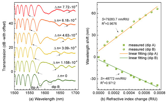 (a) Variation of interferential spectra as the ambient refractive index. (b) Wavelength shifts of Dips A and B versus ambient refractive index.