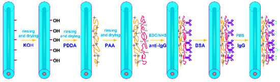 To further demonstrate the applicability and to improve upon the TTMF-based biosensor, we used it for the quantitative detection of IgG in PBS. This biodetection process is depicted in Figure 4. Prior to the functionalization, we thoroughly cleaned the microfiber surface to remove any traces of glycerin, first with distilled water and then with methanol. Immediately after, the microfiber was cleaned with distilled water and immersed into 0.1 M KOH solution for 10 min to create hydroxyl(-OH) groups on the surface. The surfaces were then washed with distilled water. Next, the fiber biosensor surface was prepared by incubation for 30 min with 1 wt% poly (diallyldimethylammonium chloride) (PDDA, Mw: 200000–350000, 20 wt% in H2O, purchased from Sigma-Aldrich, St. Louis, MO, USA). After washing with distilled water, the microfiber was immersed into 1 wt% polyacrylic acid solution (PAA, Mw: ~100000, 35 wt% in H2O, purchased from Sigma-Aldrich) to get final modification with individually spotted capture proteins. The surfaces were also washed with distilled water. The immobilization of biomolecules on device surface is an important step in biosensor development. The covalent immobilization of anti-IgG on fiber surface might lead to improper orientation by masking antigen-binding sites. This shortcoming can be circumvented by using heterobifunctional cross-linkers of EDC/NHS combination. The microfiber was immersed into a mixture (1:1) of EDC (1-ethyl-3- (dimethylaminopropyl) carbodiimide hydrochloride) and NHS (N-Hydroxysuccinimide) in 0.01 M PBS buffer for 30 min. Then, the sensor was washed thoroughly with PBS. Subsequently, functionalized fiber was incubated with anti-IgG at a concentration of 50 mg/L for 1 h to immobilize the antigen onto the fiber surface. Blocking to reduce subsequent non-specific binding was then performed by incubating the sensor with a blocking solution (3% bovine serum albumin (BSA) in PBS, pH 7.4) for 30 min. The biosensor chip was then washed with PBS for 5 min.