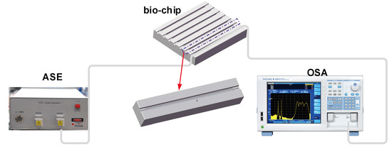 IgG and anti-IgG binding was performed by injecting and incubating 50 μL of IgG solutions at different concentrations and then rinsing the biosensor using PBS solution. The PBS rinse stage was used to establish the baseline associated to each increasing IgG concentration and to remove the unbound antigens from the previous solution. The experimental setup for the immunosensing performance characterization is illustrated in Figure 5. A broadband source (ASE) with a low polarization spectral range of 1250–1650 nm (www.optical-source.com) was used as the light source and its transmission spectra were monitored by an optical spectrum analyzer (OSA) with a minimum resolution of 0.02 nm in that spectral range. Moreover, the biosensor was embedded in a flow cell with the facilities for inserting and removing biological samples, and both ends of the flow cell were sealed with UltraViolet (UV) curable epoxy.