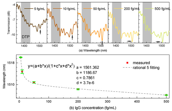 As illustrated in Figure 6a, we could easily notice that the DTP appeared at around 1400 nm when evaluating its immunosensing performance on the right side as a wavelength shift in real time. Note that the interferometric spectra share the general envelope with that immersed into the index-matched liquid while inducing several ripples across the interference. We noticed that the polyelectrolyte layers immobilized onto the surface of the microfiber could lead to exciting higher-order modes, thus probably introducing multiple interferences into the biosensor. Nevertheless, we could track the DTP region, further locating the resonant dip on the right side of the DTP, although it was not easy to determine at first. However, the evident contrast of the resonant dip happened as the concentration was increased. Besides, some experience tracking the resonant dip was necessary. Furthermore, the spectra gradually showed “blue” shift when the IgG concentration was increased. Then, the anti-IgG were gradually exhausted and the spectral shift reached a plateau at the IgG concentration of 500 fg/mL due to the saturation effect, which can be considered a complete antibody–antigen procedure process. As a result, the shifts of the dip were fitted by a rotational function with a high coefficient R2, as shown in Figure 6b.