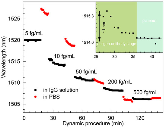 A dynamic procedure for the detection of a concentration of 10 fg/mL of IgG can be understood. Initially, the amounts of anti-IgG were rich and then it matched that of IgG, as illustrated in the enlarged window of Figure 7. Thus, the procedure reached a plateau due to saturation effect. On the other hand, the enlarged view in Figure 7 fully indicates a complete antibody–antigen conjugation process. Obviously, the processes tended to be stable after antibody–antigen binding for several minutes, which was recorded by the dynamic processes. We could easily achieve the resonant dip, thus concluding that the antibody–antigen procedure required approximately 15 min. Thus, the stability of the proposed biosensor could be revealed. Furthermore, the reusability can probably be attained by short injections of the regeneration buffer after each immune response, as the immune process is consuming and irreversible. Similarly, Zhou et al. demonstrated that the output light intensity can return to the initial level after each regeneration cycle [15]. We will further clarify this in future work.