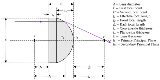 where , , , is the exponential constant, is the microlens diameter, and is the microlens thickness. Since PDMS (Sylgard 184) was used as the lens material in the fabrication process for MLAs with a constant refractive index of 1.4483 in 405 nm (“H-line”) [20], the effective focal length can be derived from Equations (5) and (7) as: