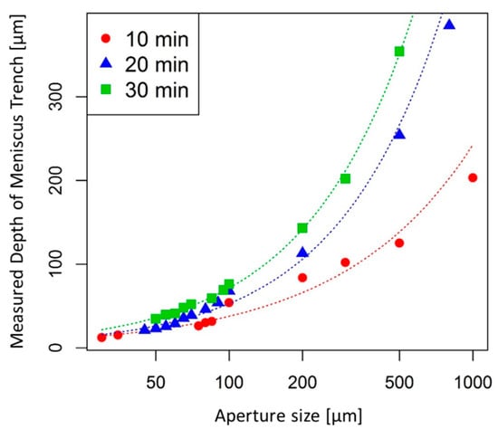The depth of the meniscus trench () can be determined by the development time and the aperture size. Figure 3 shows the measured results of the depth of the meniscus trench with various aperture sizes for three different development times (10, 20, and 30 min). This plot was generated based on statistical data obtained from the experiments, and the R2 value was 0.9446, 0.9871, and 0.9820 for 10, 20, and 30 min development time respectively, which provides a good graphical approximation on the depth of meniscus trench based on aperture sizes and development time.