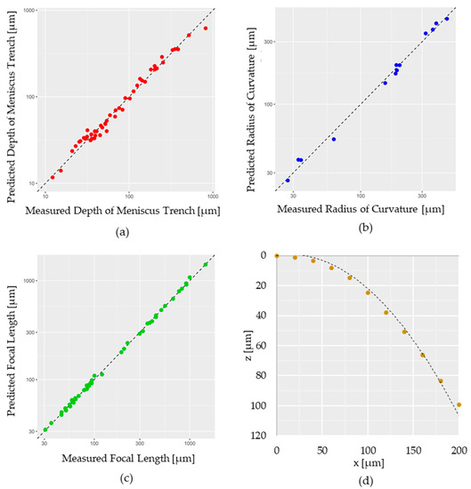 Scatter plots comparing the measured data against the predicted data using the modeling equations. The color dots represent the measured data, and the dashed line represents the predicted data: (a) the depth of meniscus trench; (b) the radius of curvature; (c) focal length; (d) surface profile.