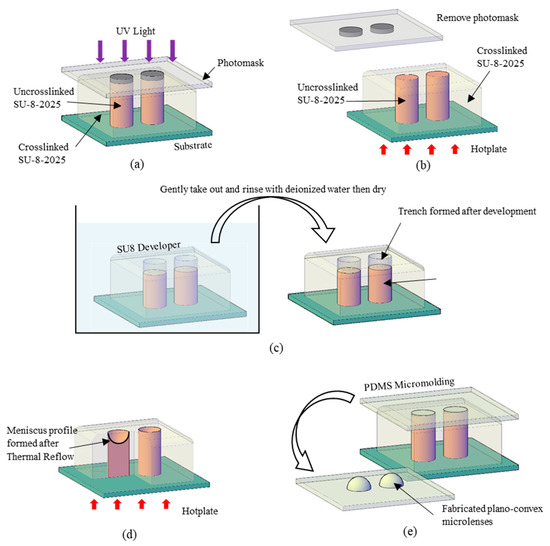 An example of TDTR fabrication process is described as shown in Figure 5. A glass slide was prepared as the substrate. The substrate was cleaned with organic solvents (acetone, methanol, and isopropanol) and baked to remove surface moisture at 95 °C for 10 min using a hotplate. A negative photoresist, SU-8 2025, was used in this fabrication process because of its excellent imaging and fast drying characteristics. 1.14 grams of photoresist was poured on a 1 × 1 in2 substrate and soft-baked at 65 °C for 20 min and increased to 95 °C for 12 h with a temperature ramping speed of 200 °C/h. After the soft-baking process, the sample was cooled down to room temperature with a temperature ramping speed of 200 °C/h. The photoresist shrunk slightly after cool down as most of the solvent gradually evaporated from the photoresist during the soft bake process, forming a 1 mm thick photoresist on the substrate. Note that the amount of photoresist was verified based on a weighing and dispense method. Also, note that in this experiment, 1 mm would be set as the maximum lens thickness possibly fabricated. A photomask with an array of various holes was placed on top of the photoresist, and the UV exposure process was followed where the exposure dose of 2.4 J/cm2 (LS 30, OAI Inc., Chicago, IL, USA) was applied as depicted in Figure 5a. The photomask was removed after the exposure process, and the sample was transferred to a hotplate for post-exposure-bake (PEB) at 65 °C for 20 min and increased to 95 °C for an hour with a temperature with ramping speed of 200 °C/h to crosslink all the exposed photoresist as described in Figure 5b. The sample was gradually cooled down to room temperature to prevent thermal-mismatch cracks on the photoresist. The sample was then developed by dipping it into SU8 developer (propylene glycol monomethyl ether acetate solution, PGMEA) for partial development depicted in Figure 5c. This partial development was time-controlled to achieve the desired amount of photoresist development. Note that this step is crucial as it determines the shape of the MLAs. The sample was gently taken out from the developer and then transferred to a hotplate for thermal reflow at 95 °C (200 °C/h temperature ramping speed) for an hour to form a smooth meniscus profile as depicted in Figure 5d. After completely cooling down the sample, UV flood exposure was followed and baked at 95 °C for an hour to finalize the meniscus profile. After the substrate has cooled down to room temperature, the mold for plano-convex MLAs was completed. Polydimethylsiloxane (PDMS) was used as the material to fabricate MLAs, considering that its micro-to-nano-molding characteristics and its high optical transparency to UV light and visible light. A micro-molding process was conducted using PDMS; 10 parts of the PDMS base were well mixed with 1 part of the curing agent then degassed in a vacuum chamber for 10 min. A clear, bubble-free PDMS solution was poured on the mold then baked in an oven at 80 °C for 3 h. After the PDMS was completely cured, it was carefully peeled off to complete the MLAs, as depicted in Figure 5e.