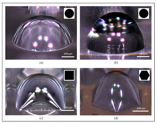 Four batches of MLAs were successfully fabricated with varying development time or photomask geometry (circular, square and hexagonal) as shown in Figure 6, where the close-up view of the fabricated microlens is demonstrated with the mask pattern (inset) that was used in the fabrication. Note that the white dots in Figure 6 are the reflection of the LED from the optical microscope that was used to capture the images.